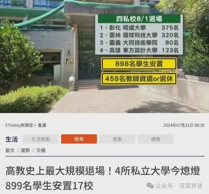 - 中国台湾近年已经上演“退场潮”。2024年7月31日,四所私立大学同日停办。此前几年已有多所院校退出。政策层面出台《私立高级中等以上学校退场条例》,引导财务恶化学校有序关停,校园资产转作养老、办公等用途。