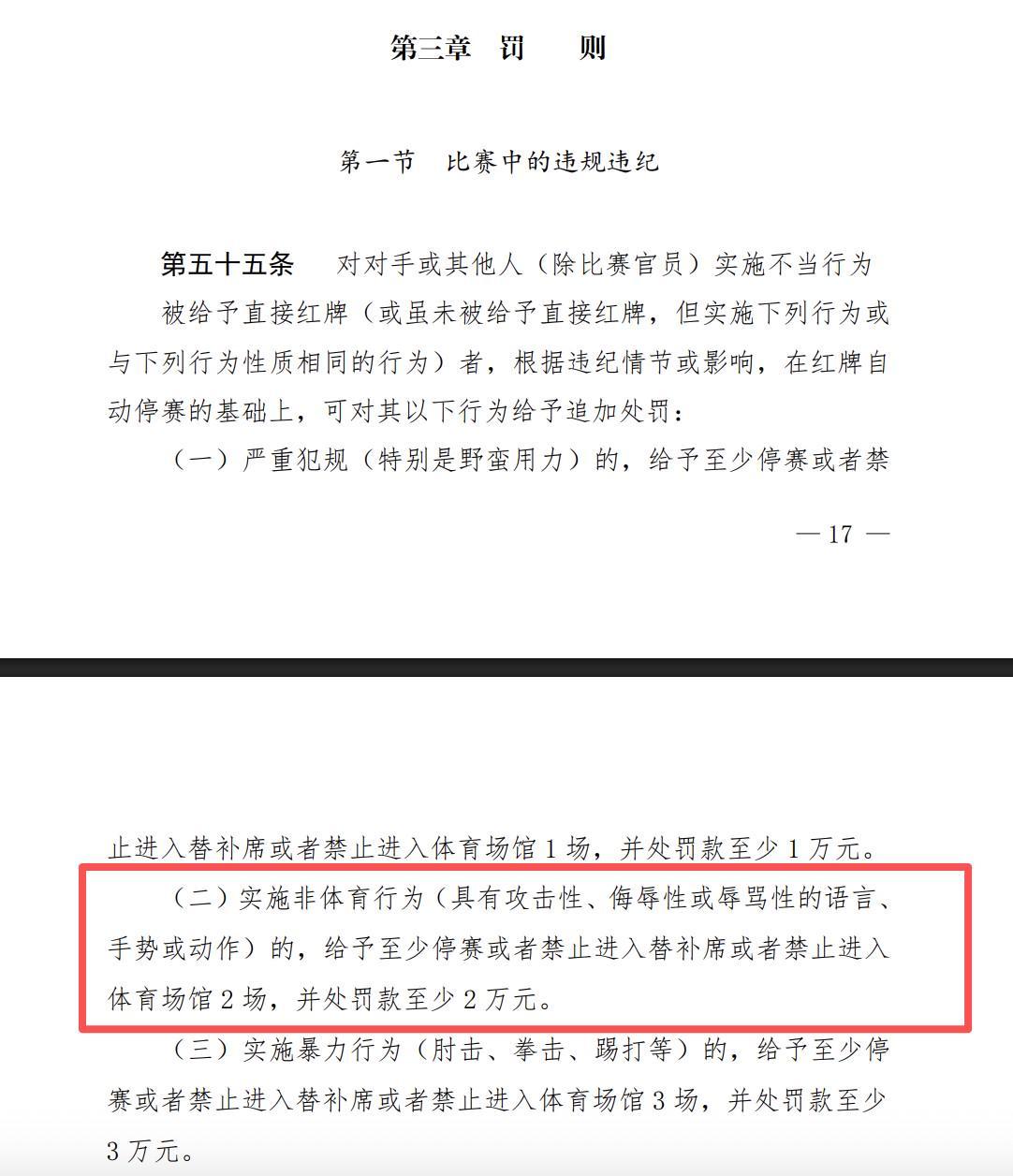 依据《中国足球职业联赛联合会纪律与道德准则》明确规定,球员实施非体育道德行为,包括使用攻击性、侮辱性或辱骂性语言、手势或动作的,应给予至少停赛或禁止进入替补席或体育场2场,并处以至少2万元罚款。
